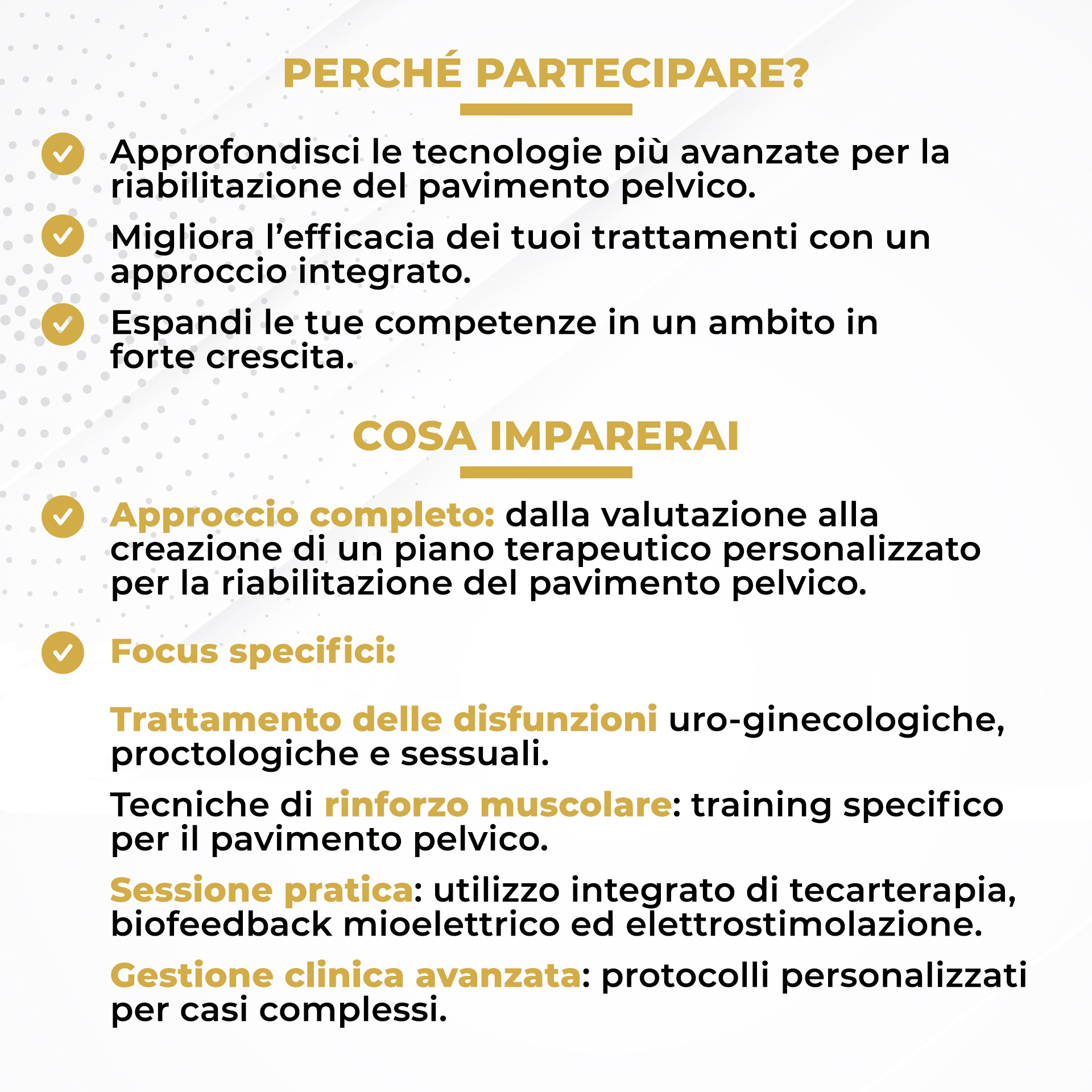 Imparerai ad individuare le strutture del pavimento pelvico per applicare la tecarterapia endocavitaria e le geometrie per i trattamenti esterni.